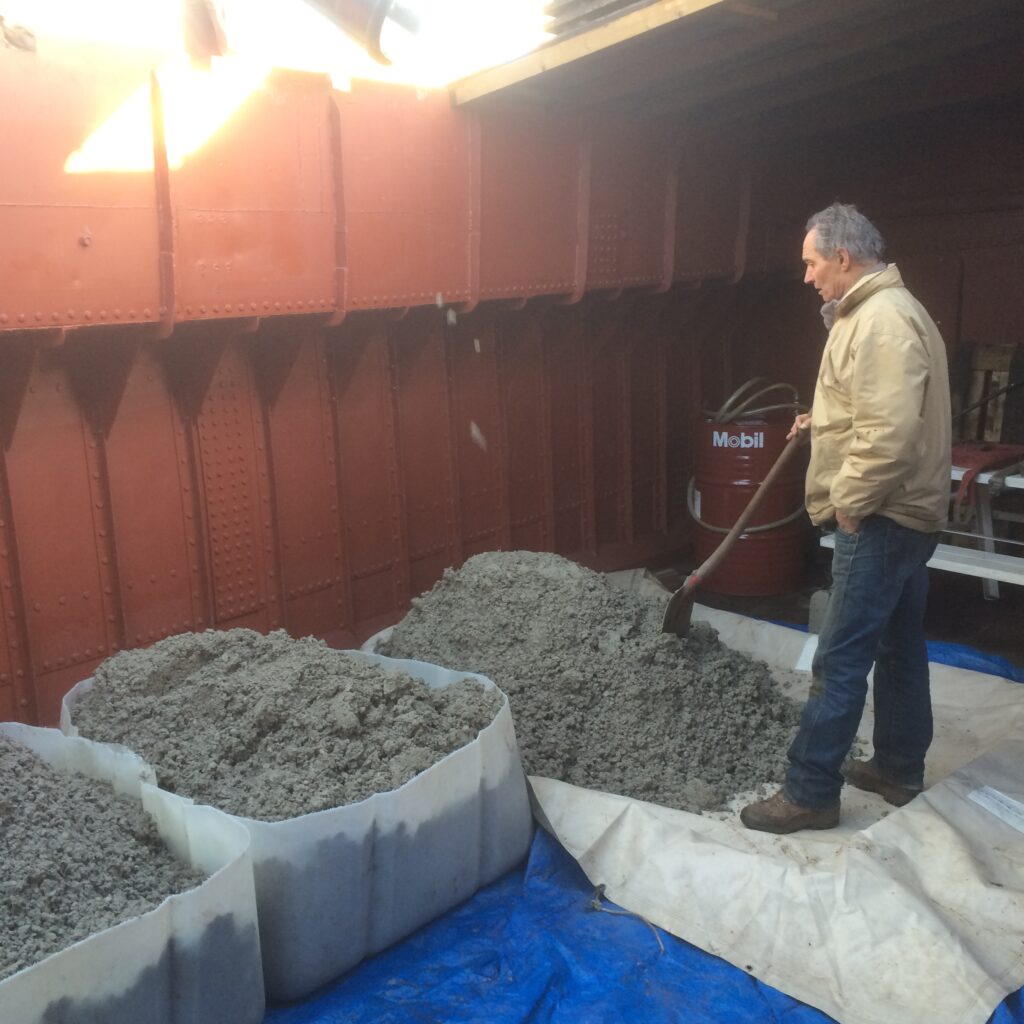 Alle materialen moeten over water worden aangevoerd. Zo ook de beton voor de fundatieplaat van de schouw.