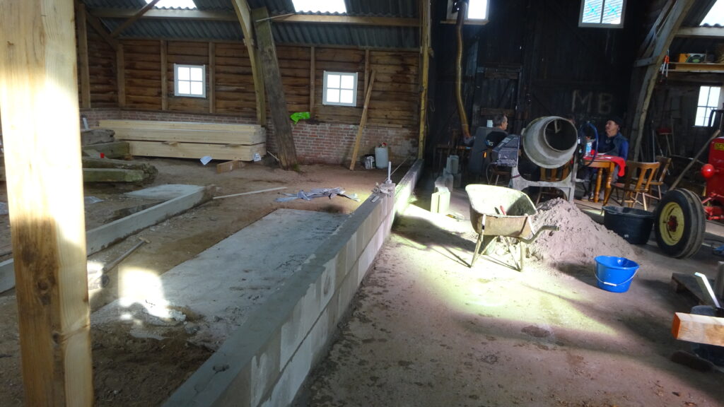 De onderkant van de scheidingswand voor de boerenkeuken is gemetseld en de fundatieplaat voor de schouw is gestort