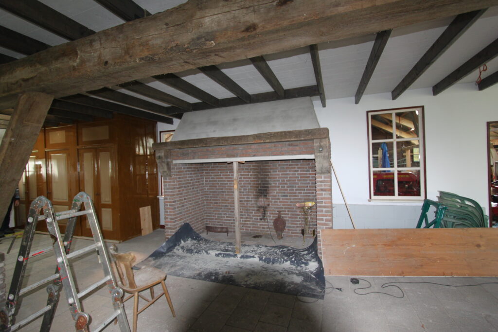 Op de voorgrond is duidelijk het hergebruikte spant uit de Langstraat te zien. De scheidingswand tussen de boerenkeuken en de stal is gereed. De schouw nadert haar voltooiing. Links naast de schouw, in de hoek van de boerenkeuken zijn authentieke bedstedes geplaatst.