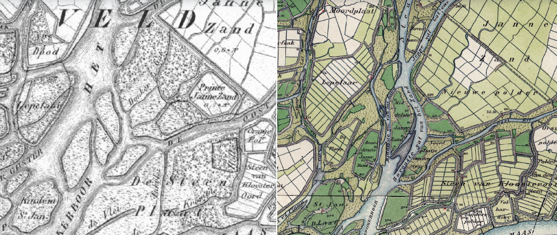 Hierboven zie je naast elkaar de kadastrale kaarten uit 1850 en 1895. Op de kaart van 1850 is voor het eerst de polder de Lepelaar goed te onderscheiden. In 1850 ligt die polder nog direct aan het grote water.